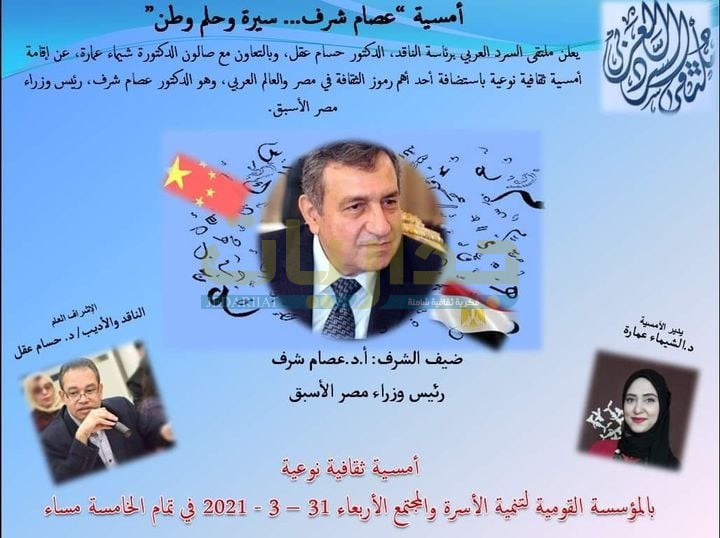 مؤسسة "عصام شرف" تؤكد لمتابعيها موعد ندوة ملتقى السرد وشيماء عمارة بواسطة أحمد عبد الله الإثنين 29 مارس 2021