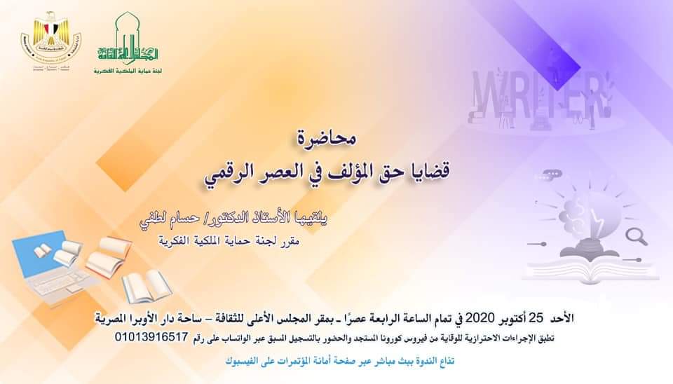 الدكتور حسام لطفي يلقى محاضرة قضايا حق المؤلف في العصر الرقمي.. الأحد بالأعلى للثقافة بواسطة جداريات 2 الخميس 22 أكتوبر 2020